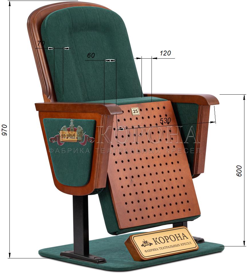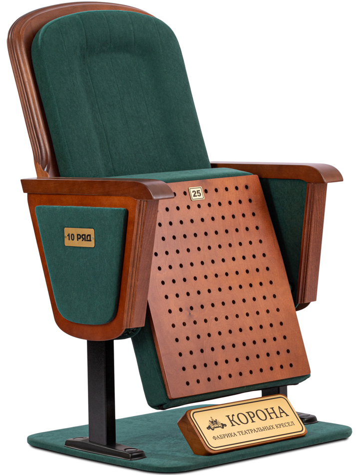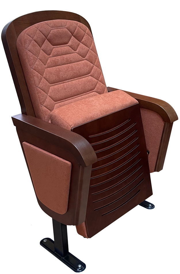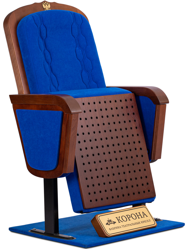 Кресло «Презент» — это образец изысканного стиля и функциональной надежности, созданный специально для театральных, концертных и конференц-залов. Его образ строится на сочетании строгой основательности и тонкой декоративной проработки, благодаря чему модель гармонично вписывается в интерьеры самых разных пространств, подчеркивая их престиж и значимость. Высокая мягкая спинка кресла обеспечивает комфортное положение тела, позволяя зрителю сохранять удобство даже во время длительных мероприятий. В её конструкции используется плотный пенополиуретан, применяемый в автомобилестроении, что делает посадку особенно упругой и долговечной. Мягкая часть спинки обрамлена цельной деревянной рамкой — обечайкой, которая окружает её по всему периметру и украшена декоративным рисунком в трёх плоскостях. Эта деталь превращает кресло в произведение мебельного искусства: строгая геометрия обечайки гармонирует с плавностью мягкой формы, создавая цельный и элегантный образ.