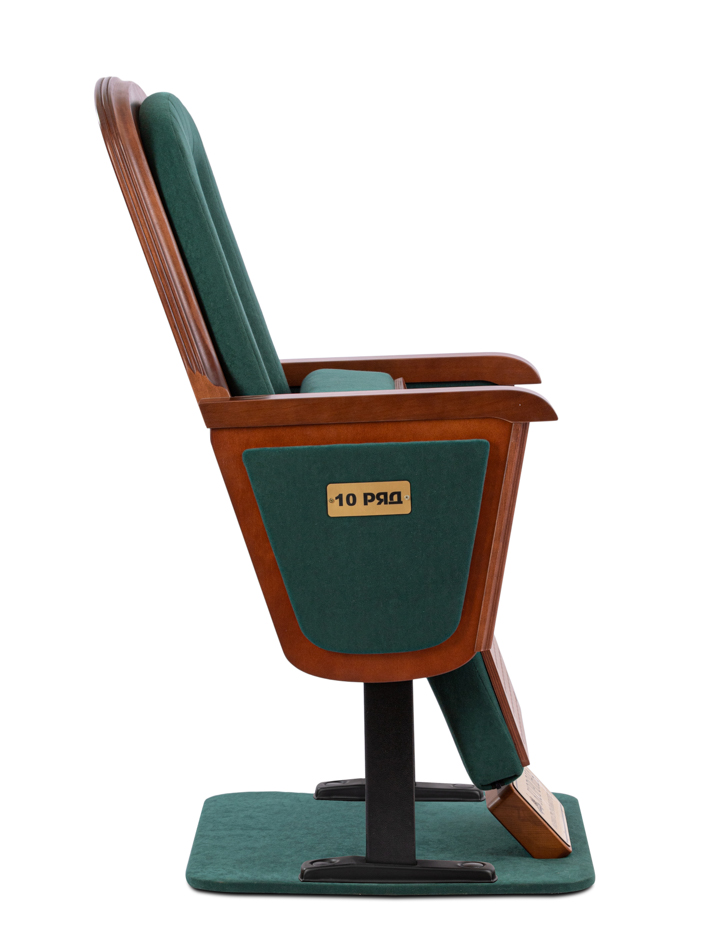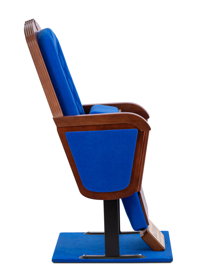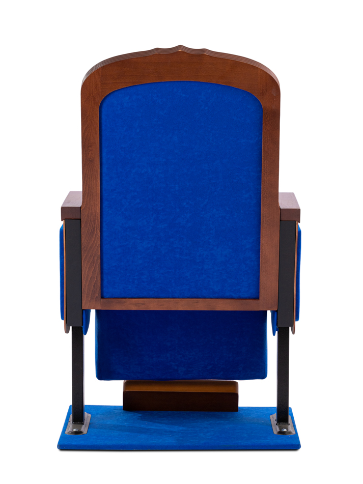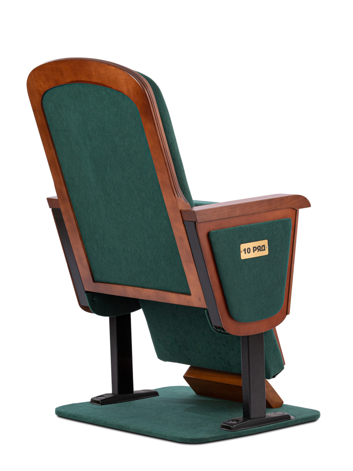 Особое внимание заслуживают подлокотники и нижняя часть конструкции. Деревянные подлокотники подчеркивают благородный характер модели, а декоративные вставки в ножке придают ансамблю завершенность. Металлический каркас основания обеспечивает прочность и устойчивость, в то время как декоративная отделка и гармоничное сочетание материалов создают ощущение цельности и высокого уровня исполнения. Задняя часть спинки оформлена шпонированной декоративной заглушкой, которая завершает общий образ кресла и делает его эстетически привлекательным даже с тыльной стороны. Благодаря этому «Презент» идеально смотрится в зрительных рядах, формируя стройный и торжественный ансамбль.