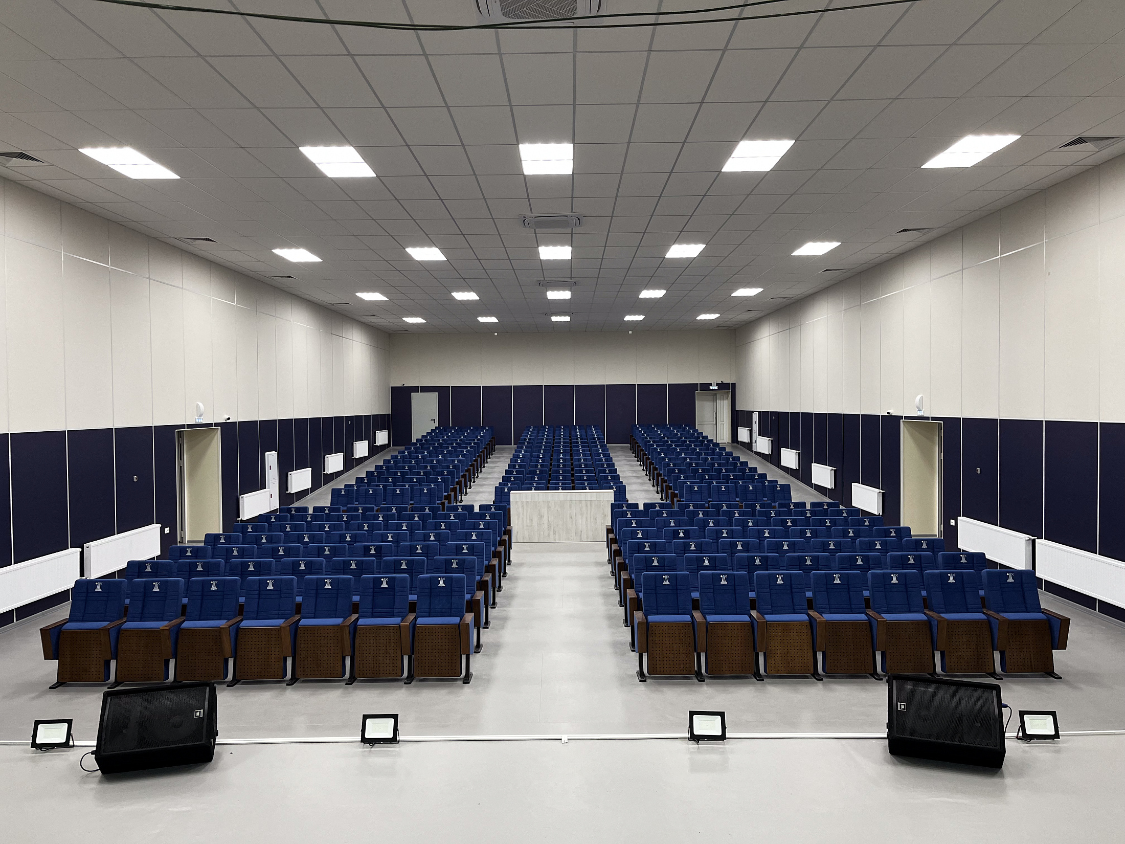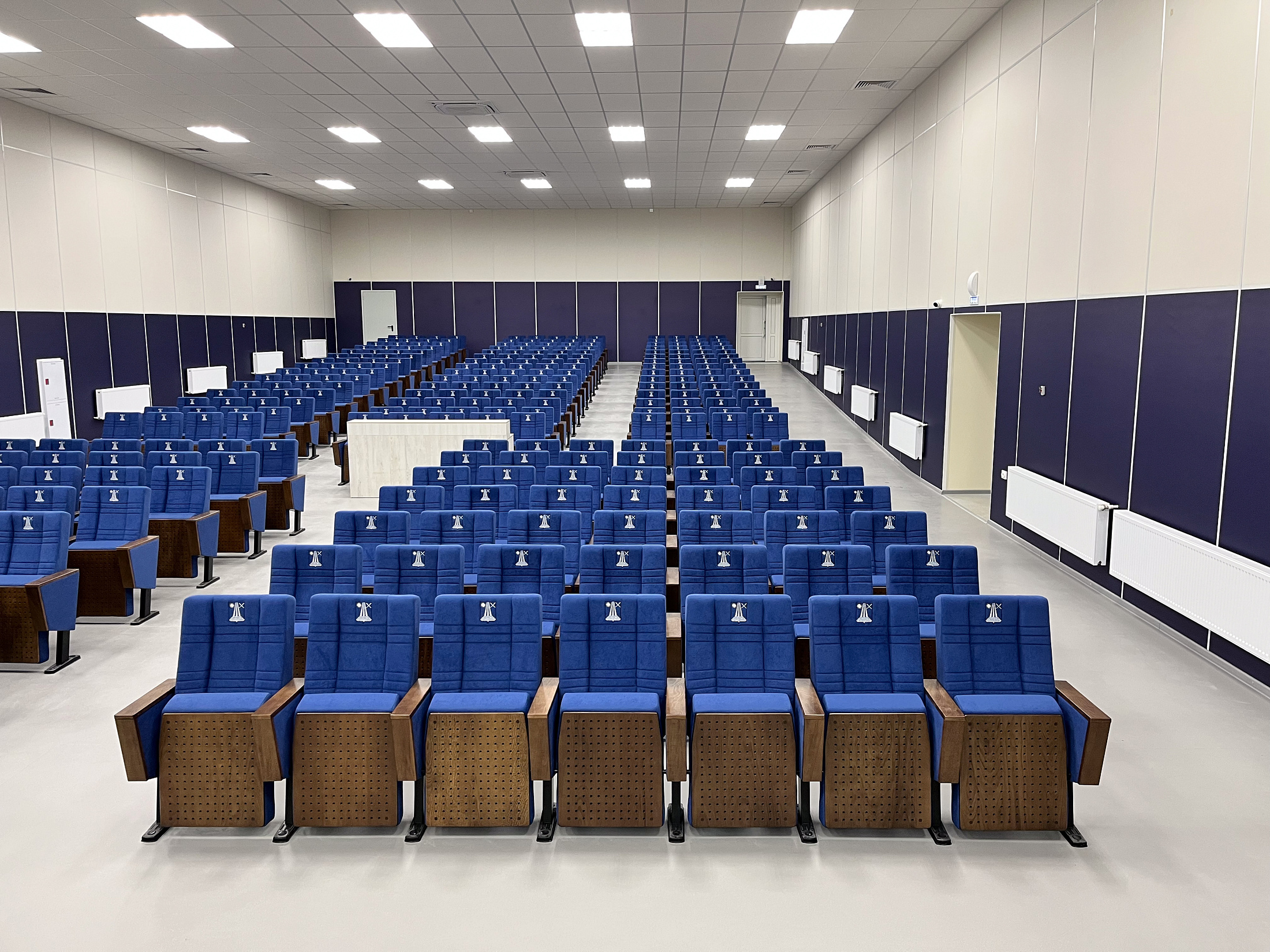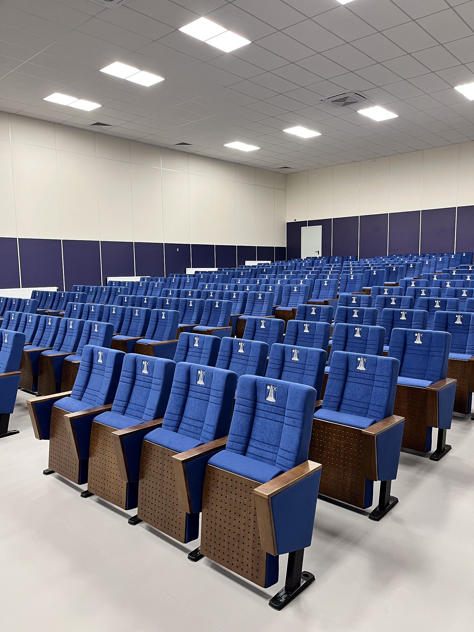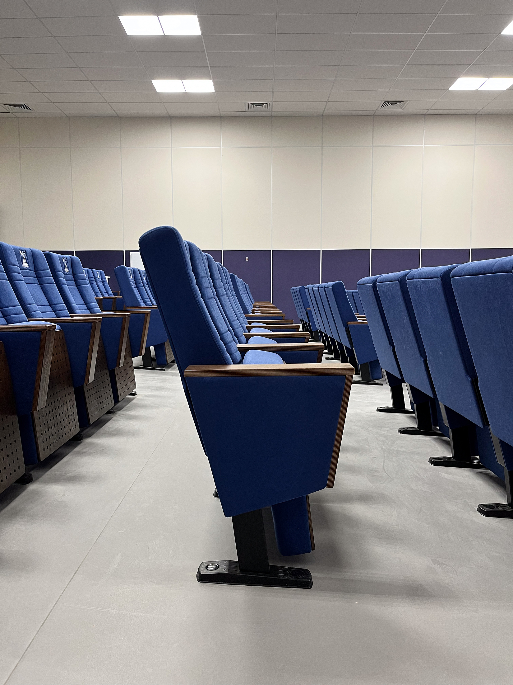 Главная ценность кресла «Дербент» заключается в заботе о зрителях. Спинка имеет тщательно рассчитанный изгиб, повторяющий естественные очертания позвоночника, благодаря чему посадка остаётся комфортной даже при длительном пребывании. Мягкое сиденье сочетает в себе упругость и комфорт, обеспечивая равномерное распределение нагрузки и предотвращая ощущение усталости. Используемый механизм работает по принципу естественной гравитации: после того как зритель встаёт, сиденье бесшумно возвращается в исходное положение, не создавая лишних звуковых эффектов. Это особенно важно для залов с высокой акустикой, где тишина становится неотъемлемой частью восприятия происходящего. Дополнительная опция в виде встроенного столика в подлокотнике расширяет функциональность кресла — теперь можно с удобством разместить программу мероприятия, записи или личные вещи, сохраняя порядок и не нарушая общую эстетику интерьера.
