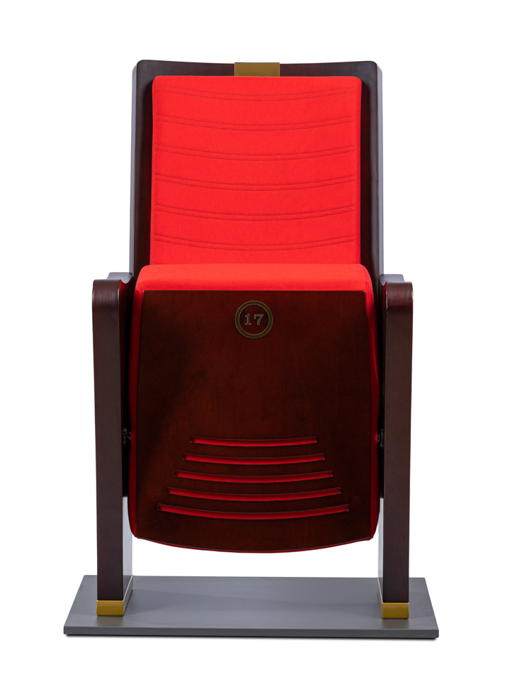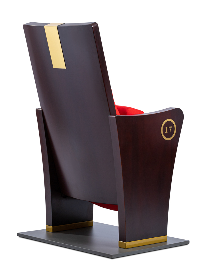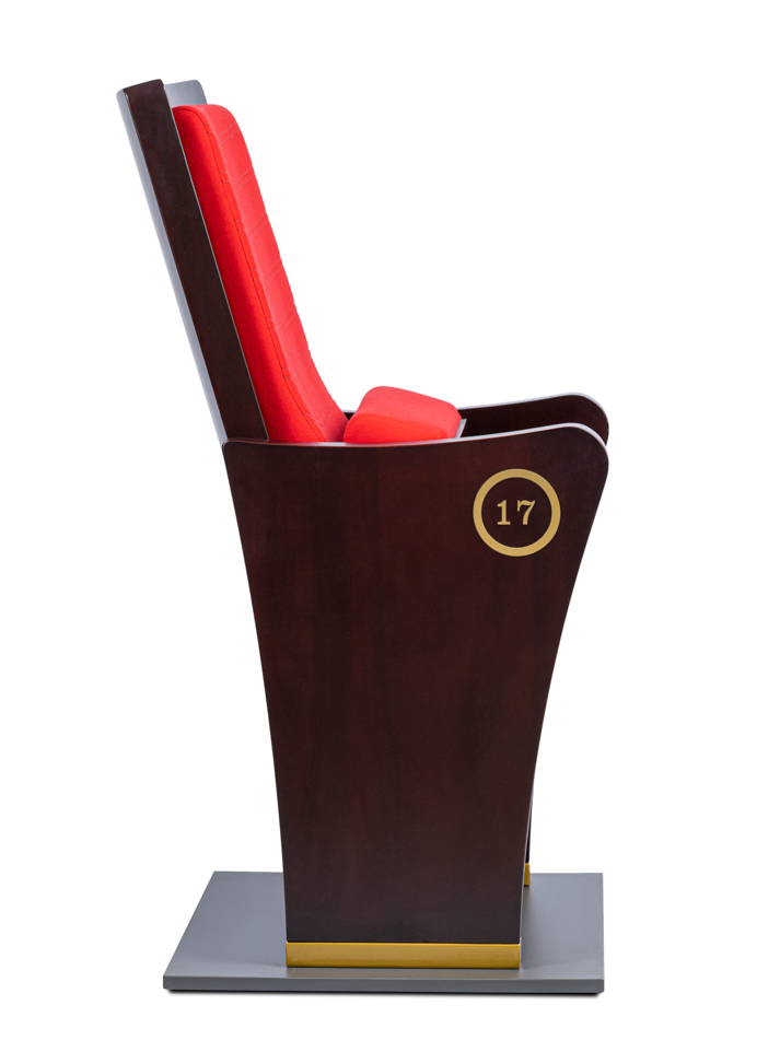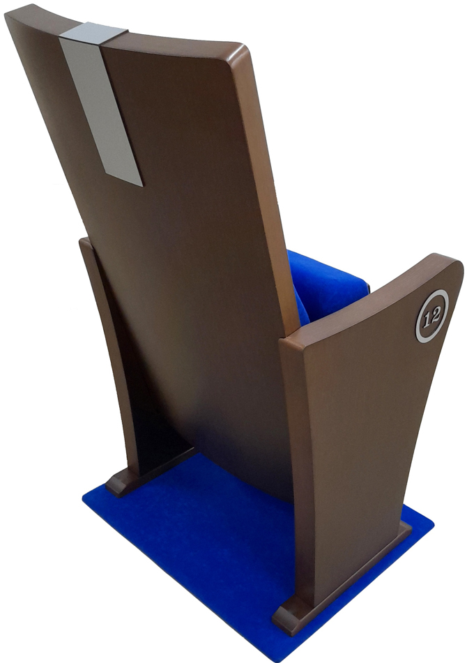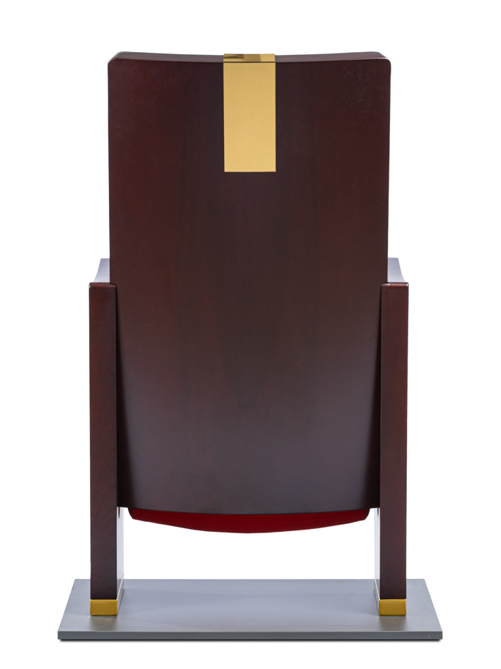 Каркасная часть спинки также полностью шпонирована со всех сторон, что делает кресло «Классика» эстетически завершённым и элегантным с любого ракурса. Такая деталь особенно важна для больших зрительных залов, где кресла видны со всех сторон и каждая линия интерьера играет свою роль в создании общей атмосферы. Качественная шпонованная поверхность подчёркивает утончённость модели и создаёт впечатление целостности, превращая спинку кресла в настоящий элемент архитектурного декора.