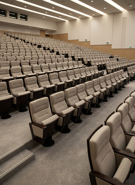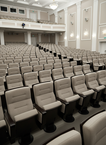 Подлокотники модели не ограничиваются декоративной функцией. При необходимости в них можно встроить выдвижные столики, которые остаются незаметными в сложенном состоянии, но легко трансформируются в рабочую поверхность. Такое решение делает кресло особенно ценным для конференций, лекций и деловых мероприятий, где зрителям важно иметь возможность комфортно разместить ноутбук или документы.