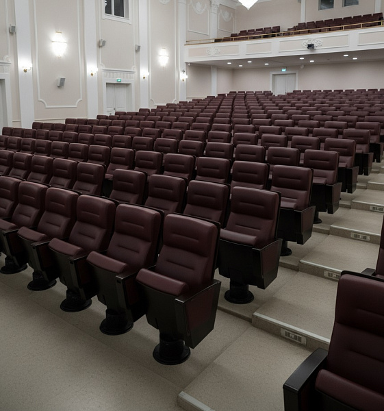 Горизонтальные утяжки, расположенные на поверхности спинки, выполняют сразу две функции: они придают креслу дополнительную выразительность и в то же время способствуют естественной вентиляции. Это решение обеспечивает ощущение лёгкости и свежести, что особенно важно для залов с длительными мероприятиями. Визуально утяжки создают игру линий, делая модель более динамичной и современной.