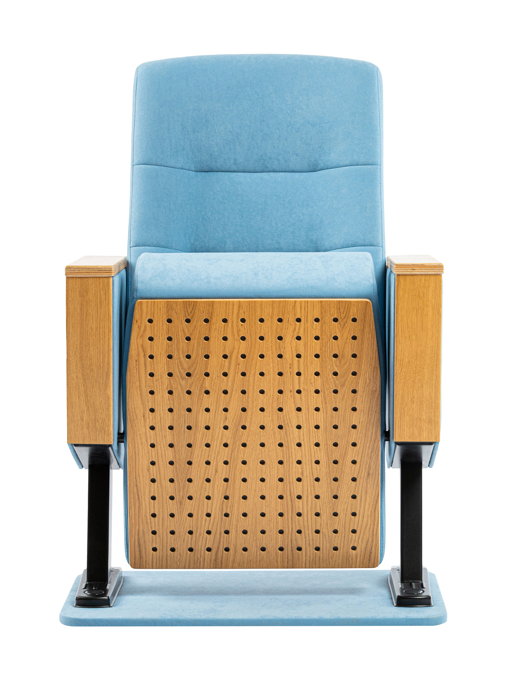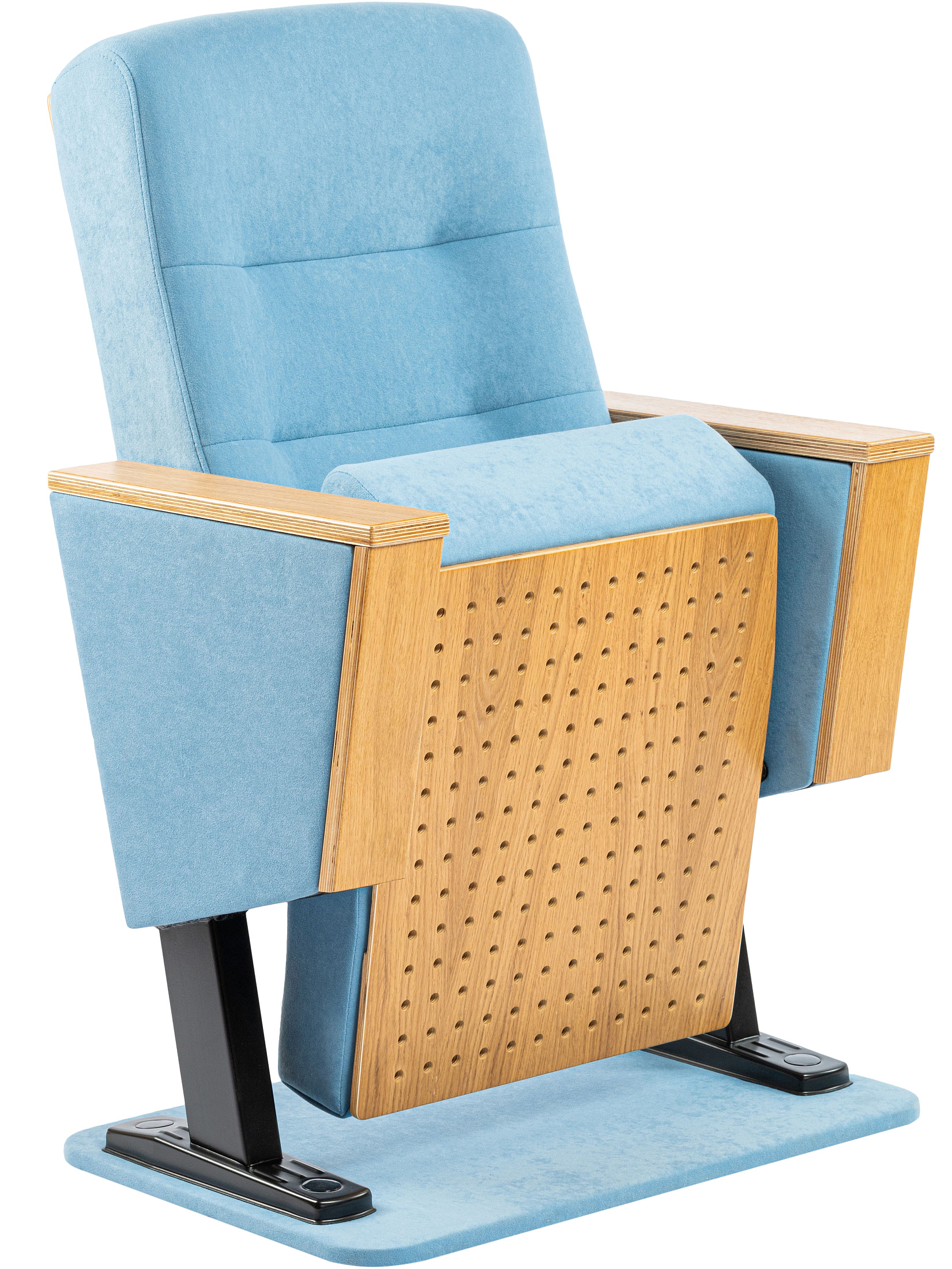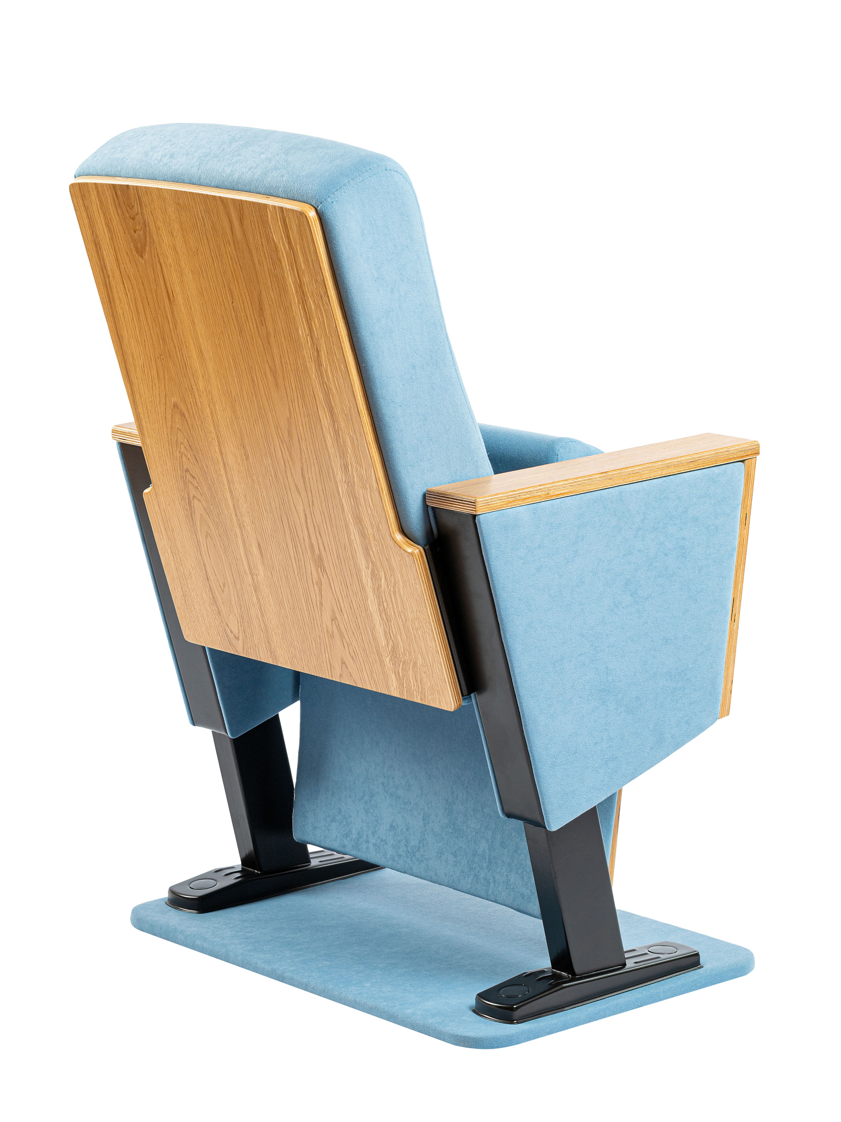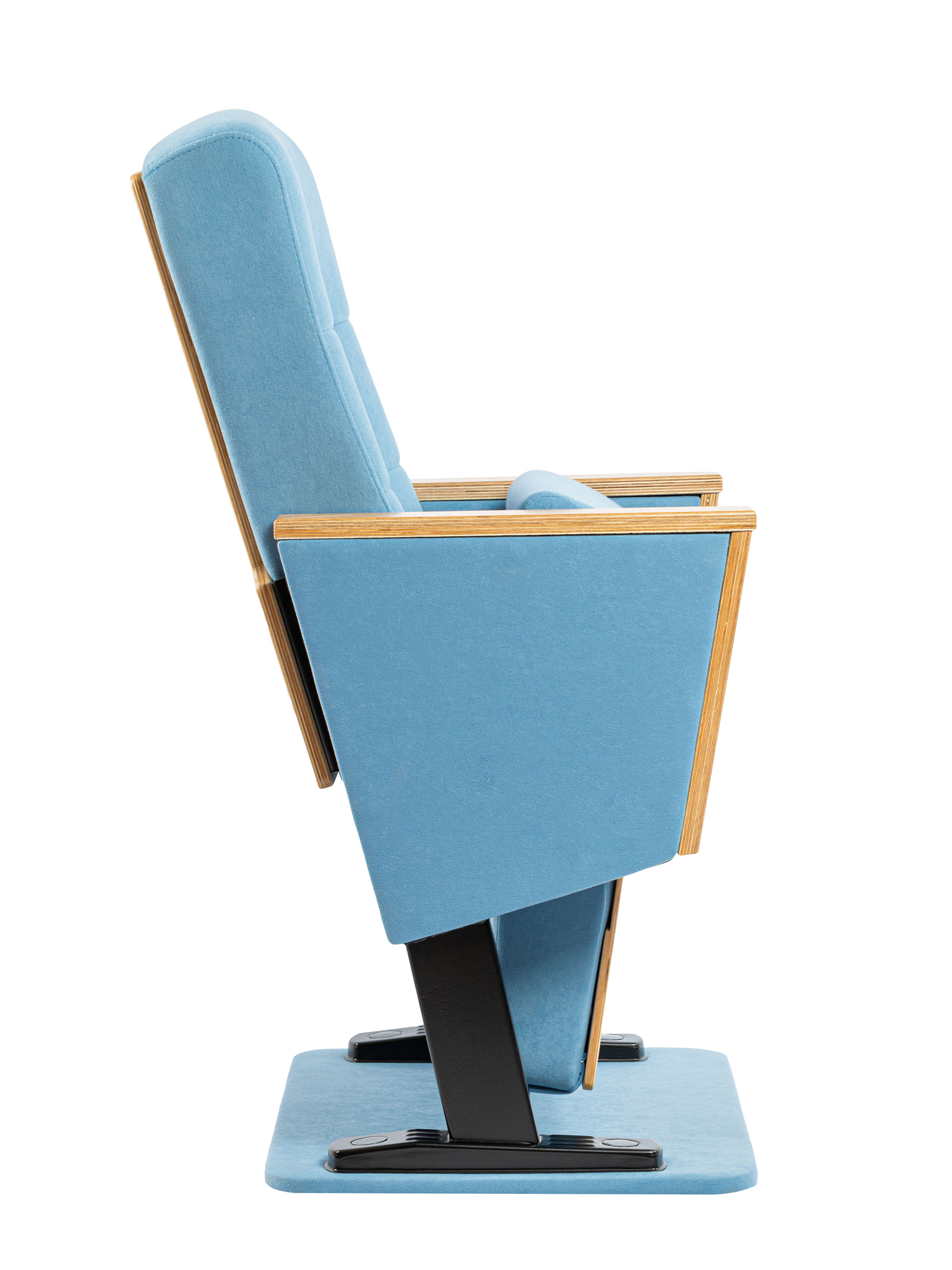 Каркас кресла изготовлен с использованием металлоконструкции, скрытой внутри мягких элементов, что обеспечивает не только надёжность, но и отсутствие лишних визуальных деталей. В качестве наполнителя используется формованный пенополиуретан повышенной плотности, сохраняющий форму даже при интенсивной эксплуатации. Сиденье снабжено гравитационным подъёмным механизмом, работающим бесшумно и не требующим дополнительного обслуживания. Нижняя часть сиденья выполнена из натурального шпона с перфорацией, обеспечивающей звукопоглощение и повышающей акустический комфорт в помещении. Боковины и подлокотники также отделаны шпоном, что создаёт единое гармоничное визуальное восприятие всей конструкции. Обивка кресла выполнена из износостойкой мебельной ткани, устойчивой к выгоранию, истиранию и механическим повреждениям. Опорная часть кресла представляет собой надёжную металлоконструкцию из профилированной стали, защищённую от коррозии порошковым полимерным покрытием. Монтаж кресла осуществляется с фиксацией к основанию пола через металлические анкерные пластины, что обеспечивает стабильность и безопасность при эксплуатации.