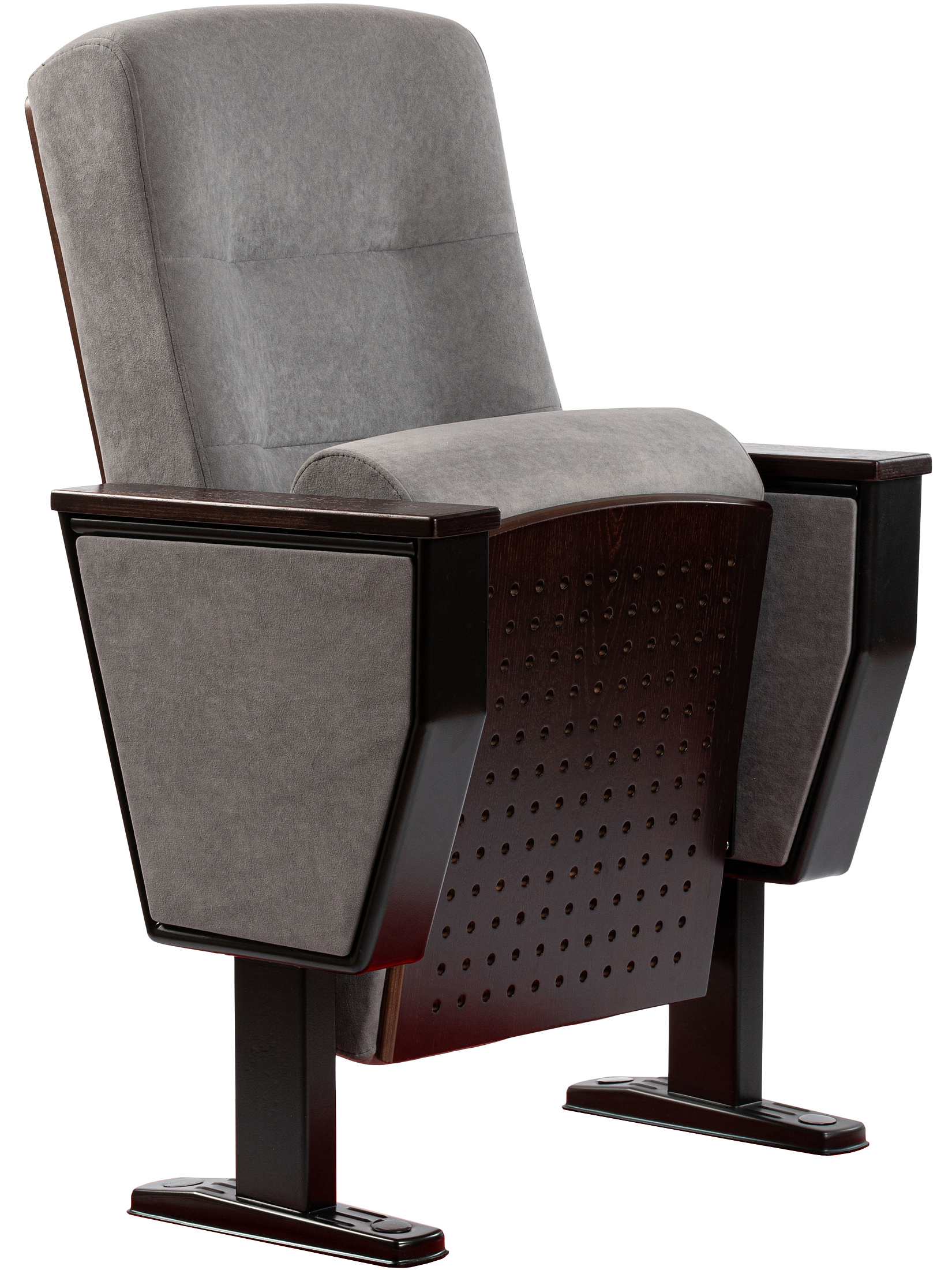 Мягкая часть спинки и сиденья кресла выполнена с использованием высококачественного пенополиуретана, что обеспечивает долгий срок службы и сохранение формы даже при интенсивной эксплуатации. Эргономичный изгиб спинки повторяет естественные линии позвоночника, поддерживая правильное положение тела и позволяя сохранять комфорт даже во время длительных мероприятий. Сиденье оборудовано надёжным гравитационным механизмом складывания, благодаря которому оно плавно и бесшумно возвращается в исходное положение, поддерживая порядок в ряду и создавая ощущение гармонии и аккуратности.